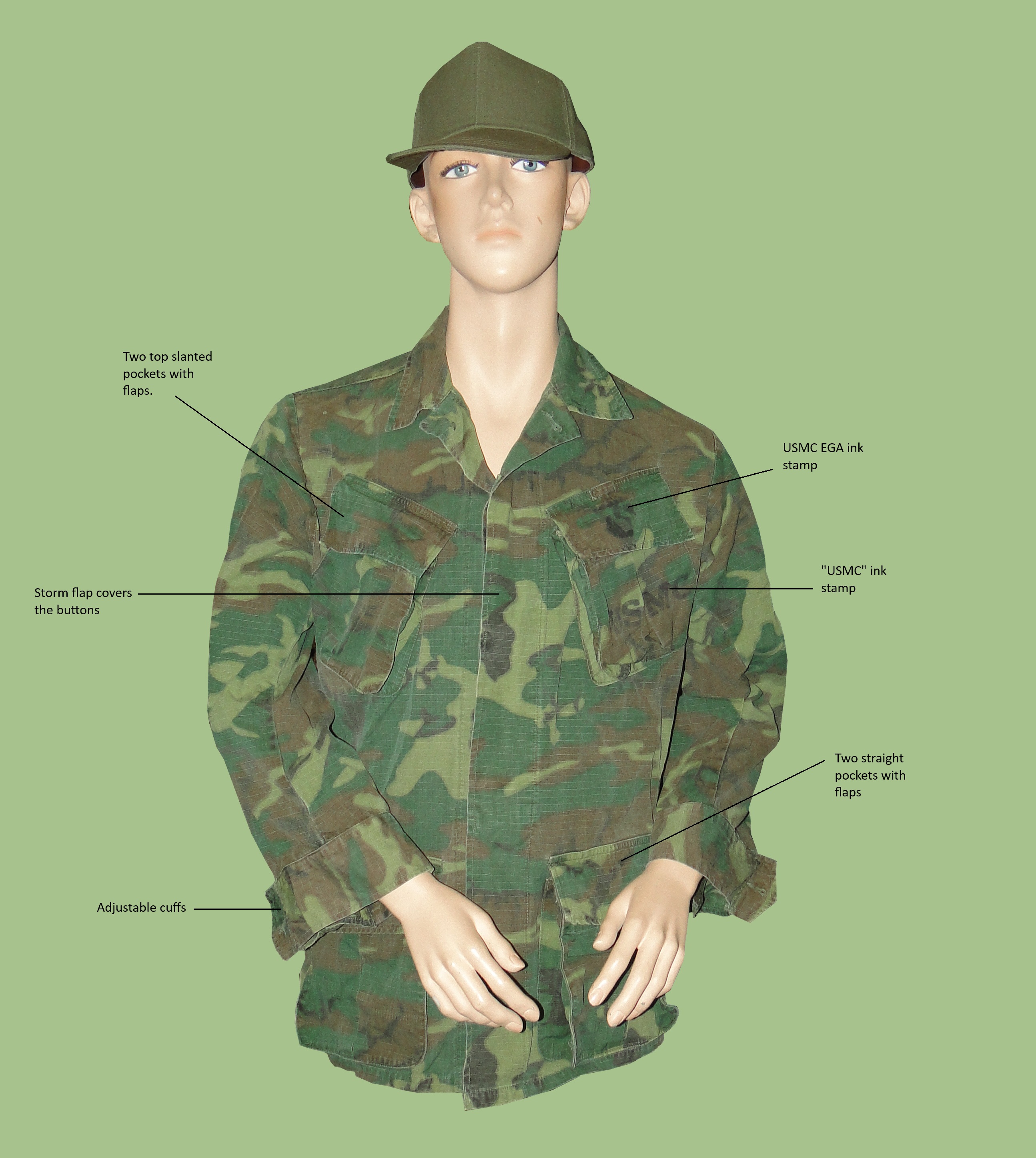 "Slant pockets".  ERDL pattern camouflage.  The front was closed via the use of green, plastic buttons.