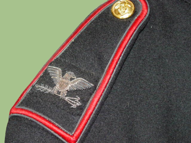 The epaulets have a colonel bird insignia exquisitely embroidered on them.  Silver color.  very high quality metal thread.  A metal golden button helps