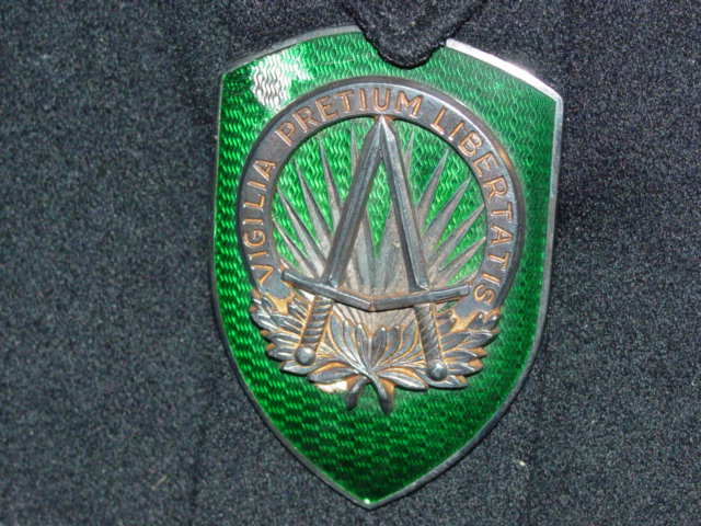 The words "Vigilia Pretium Libertatis".  Sun rays on the background. Beautifully constructed badge.  SHAPE was the central military command