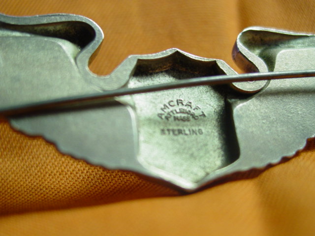 Silver. Manufactured by Amcraft. The design consists of a shield with extended wings