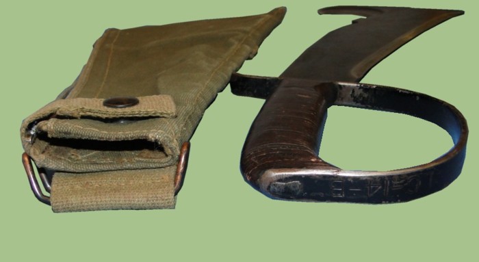 This is a WWII US Army Air Force (AAF) pilot survival/escape knife. A very interesting and large blade. The handle has a metal hand guard. Compressed leather rings form the grip. Complete with the canvas scabbard. marked LC-14-B on the handguard.