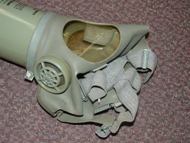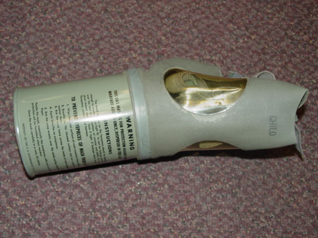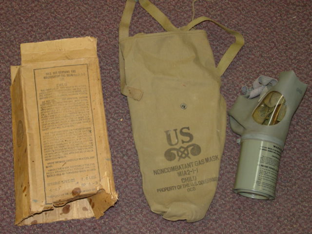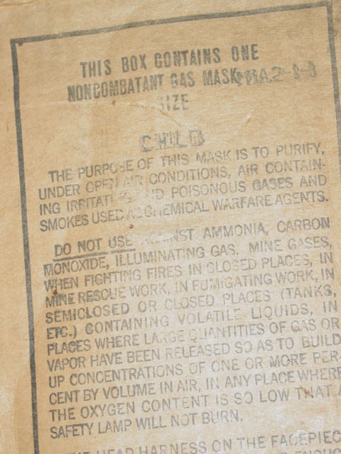 The WWII US civilian gas mask for children was issued in a cardboard box. It came with a canvis carrying bag