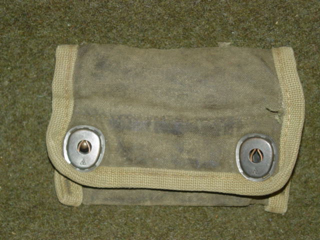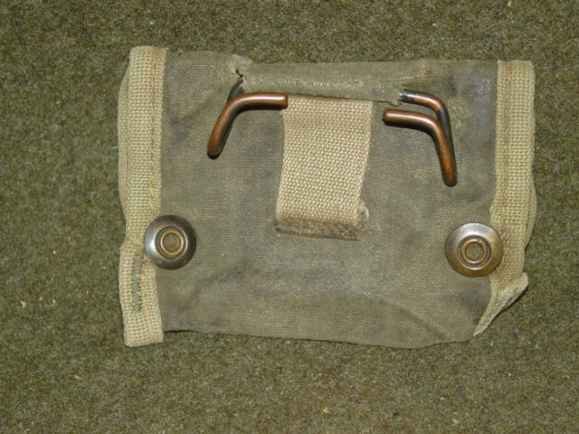 The compass pouch is of standard canvis construction. Two snaps would secure the lid shut. A brass wire hook attaches