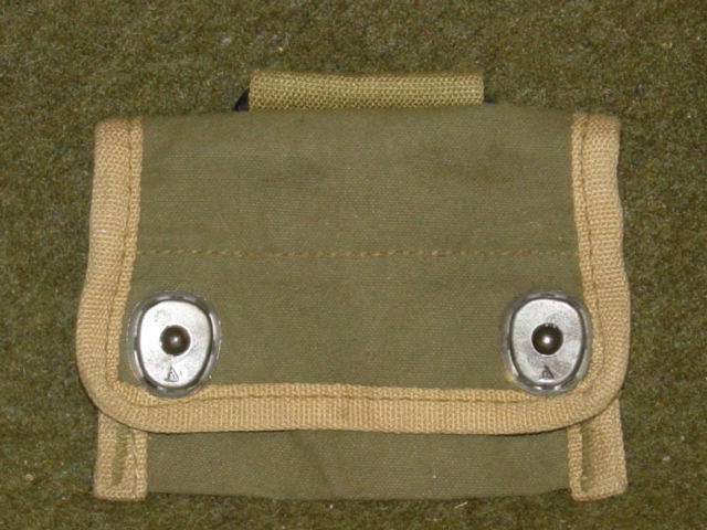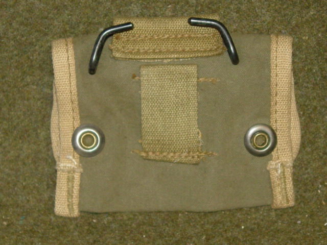 pouch. Originally developed in WWI. of canvis construction. Reinforced edges. Metal hanging device.
