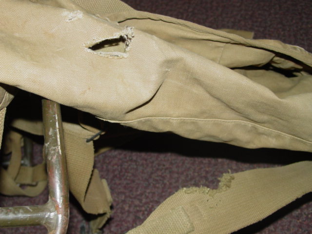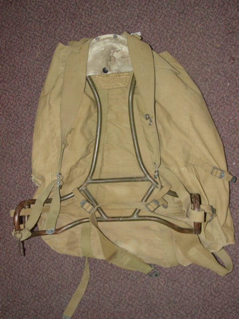 front and sides. Of khaki canvis construction. The pack is supported by a metal frame. It has a