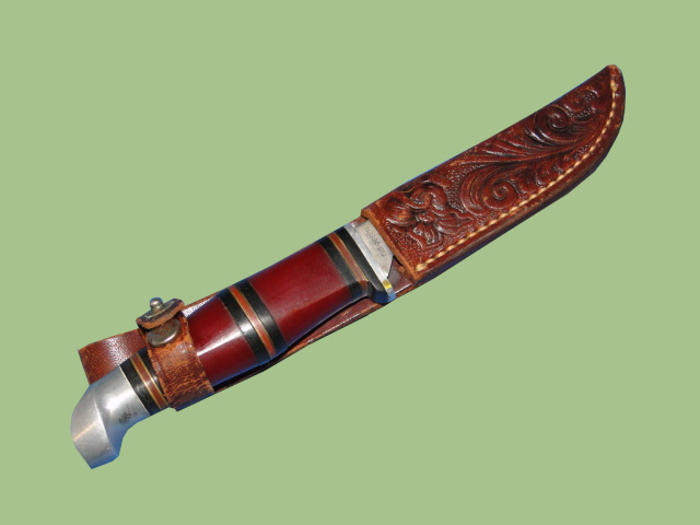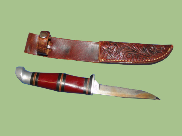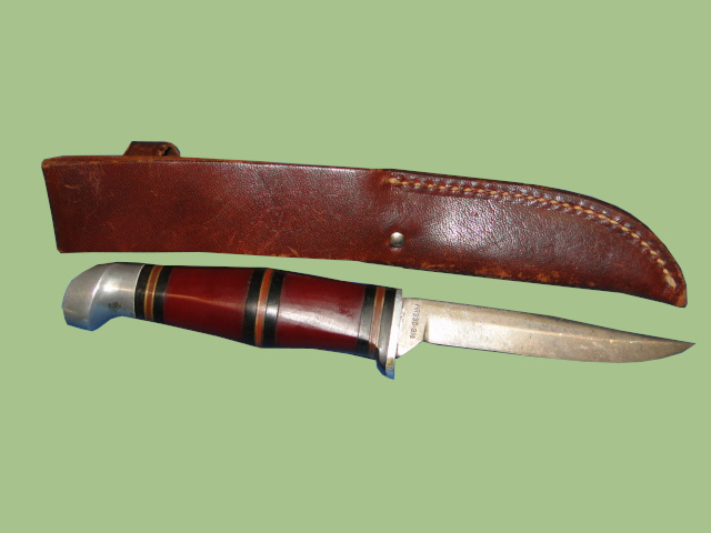 This is a knife that was produced during WWII.  Wooden handle composed of a series