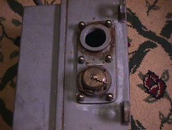 The side of the case has a couple of openings where wiring would be connected. A bronze plaque is