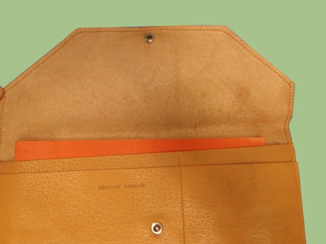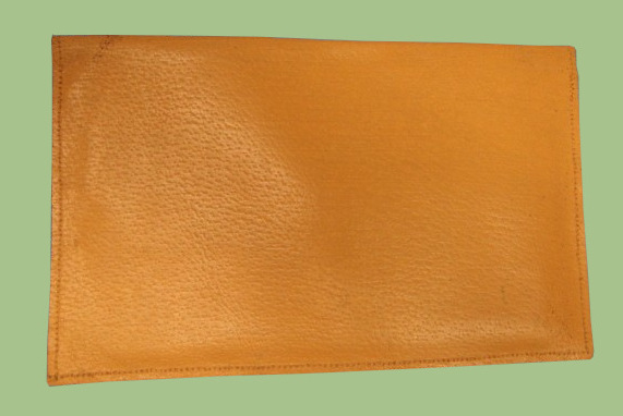 This is a stationary set kit.  Of leather construction.  Khaki color.  Single snap closure.