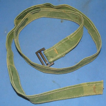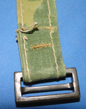 As issued to marines during WWII. Of cotton construction. Camouflage color. The design consists of a strap with a metal buckle at one end. This is a general purpose strap. It was used to secure items to the backpack.
