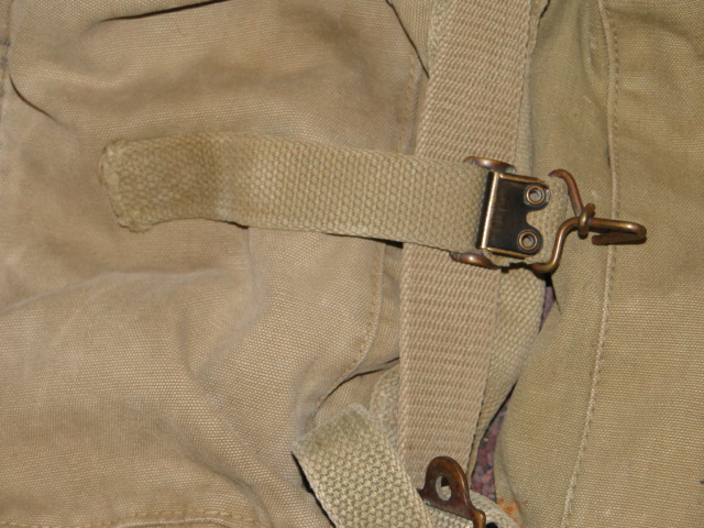 the T-handle shovel is attached to the pack. All the hardware, buckles and hooks, are