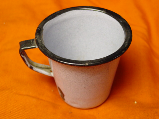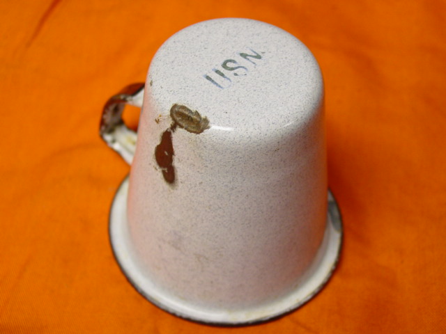This is a US Navy cup. As issued during World War two. Of metal construction with white enamel