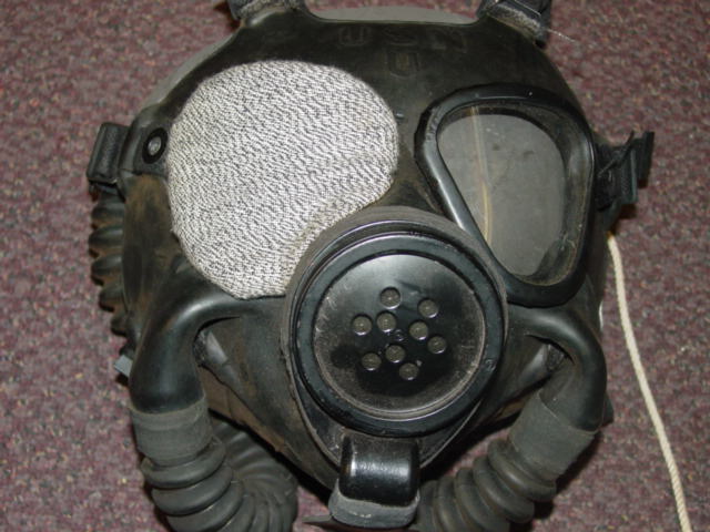 The gas mask featured here retains one of the original lense protectors. Consisting of a cloth piece