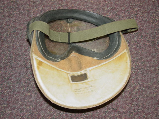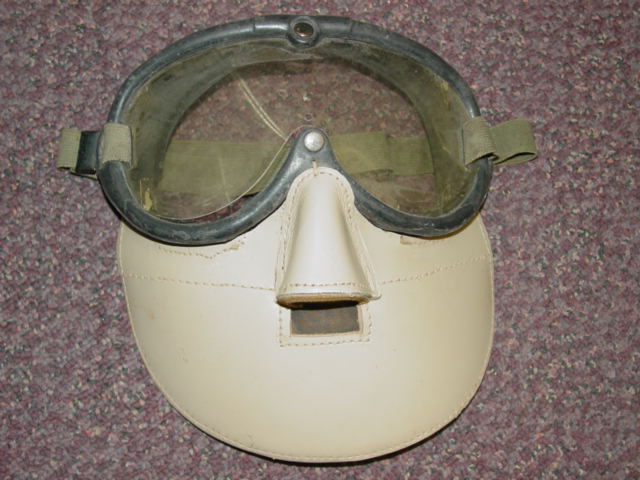 Nose opening to allow the soldier to breathe while wearing the mask. A standard set of WWII US Army goggles are sewn