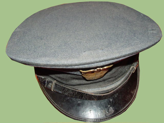 This is a WWII US military academy dress hat. Of blue wool construction with a black leather visor and a matching chin strap. A metal version of the shield of the school is placed in the front of the hat. the mid-section of the hat is a darker color blue and is of elastic type.