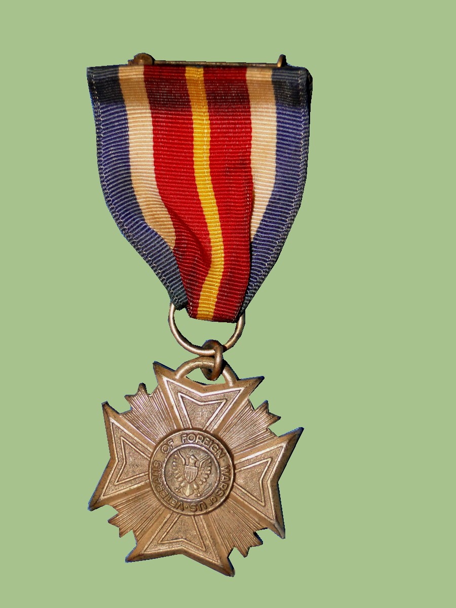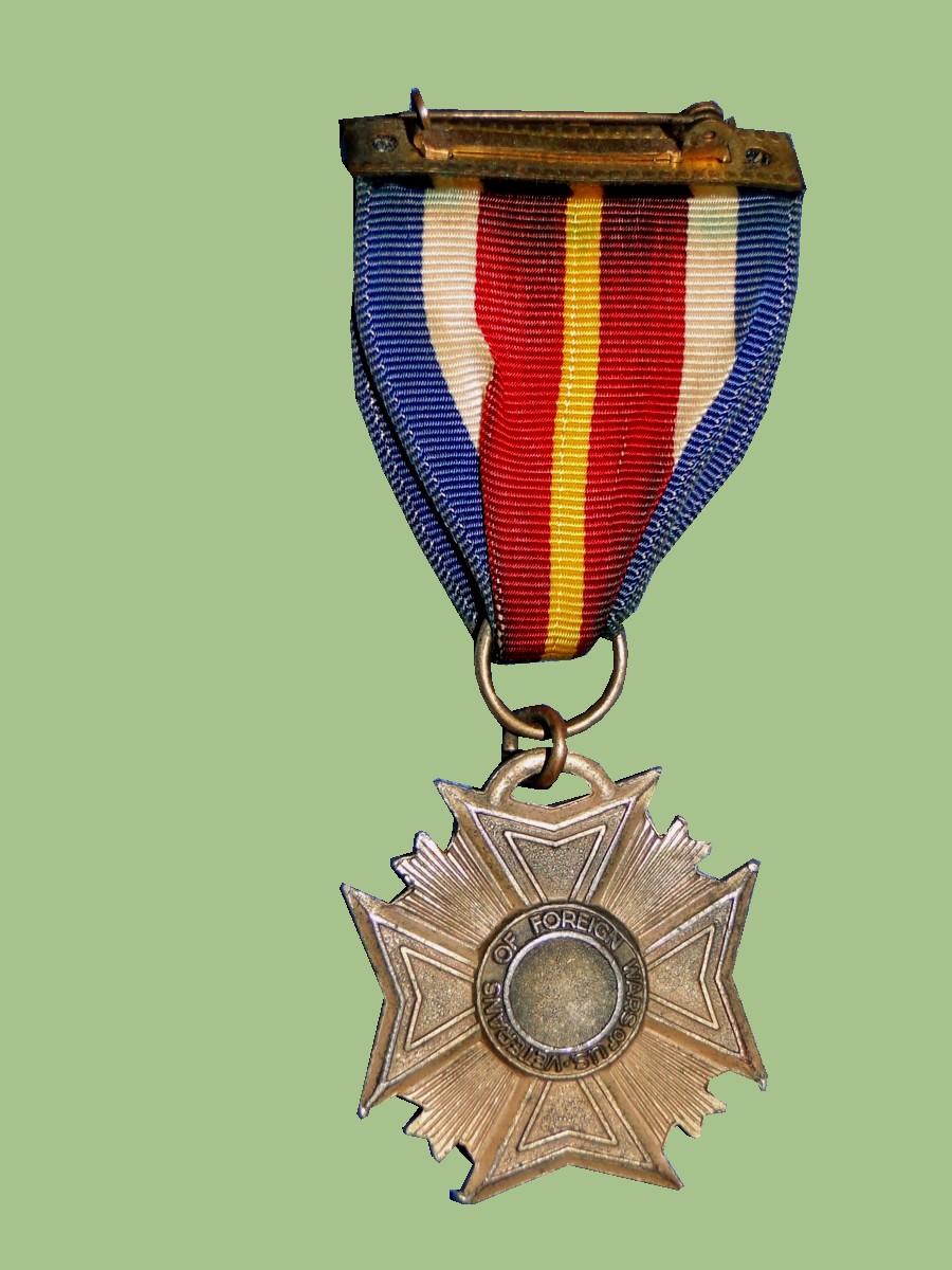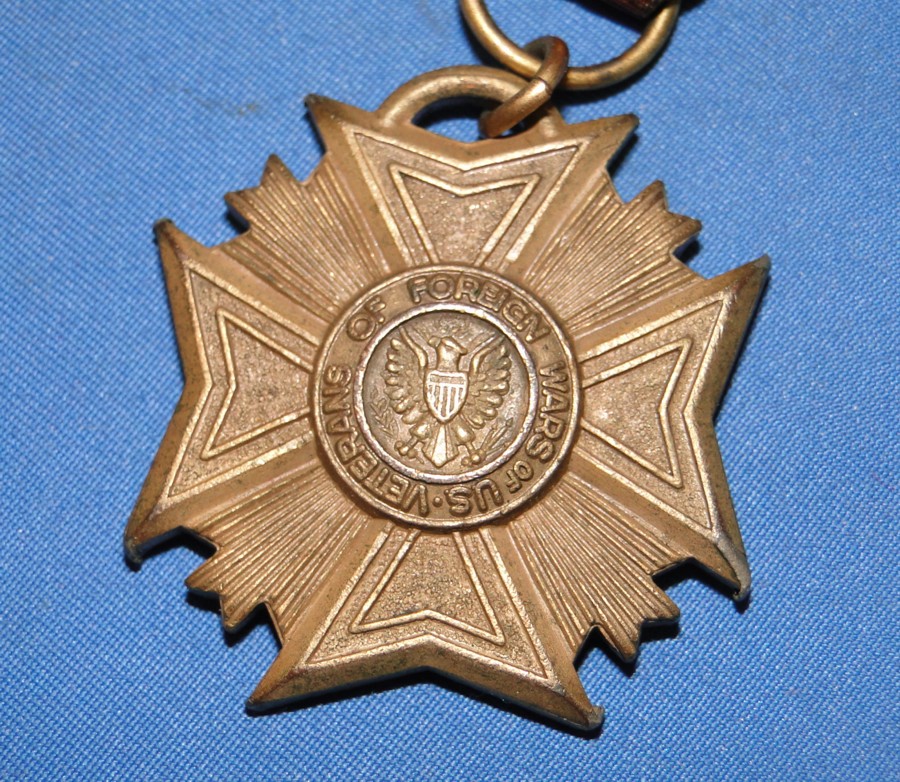 The VFW medal design consists of a Maltese cross with a starburst. The center has an eagle inside a circle. The words