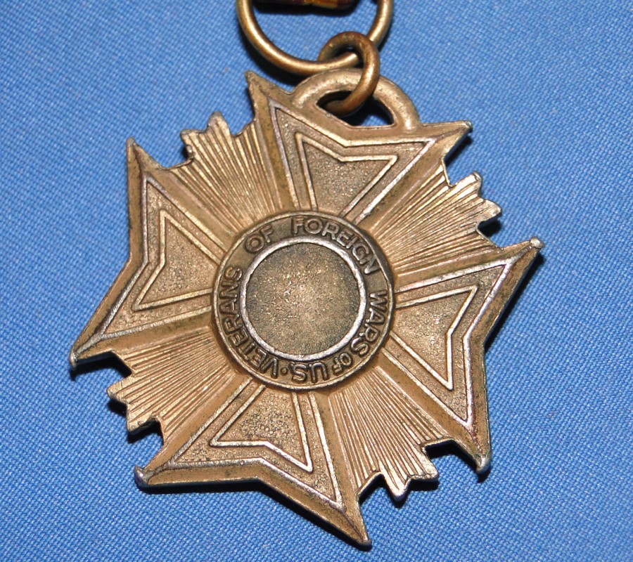 "Veterans of foreign wars of US". The back has an empty circle with the same words on the perimeter. The ribbon is of