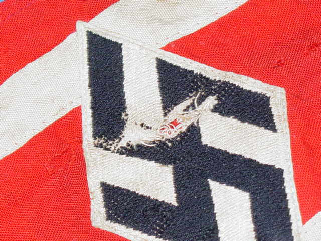 A closer look at the swastika reveals that it has been embroidered with black thread to