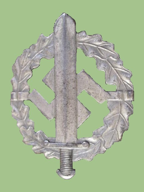 This is a German WWII Bronze Sports badge. It later became known as the "SA Defense Badge". This badge was instituted on January 19th, 1939. It was produced in three different grades: Bronze, Silver and gold.