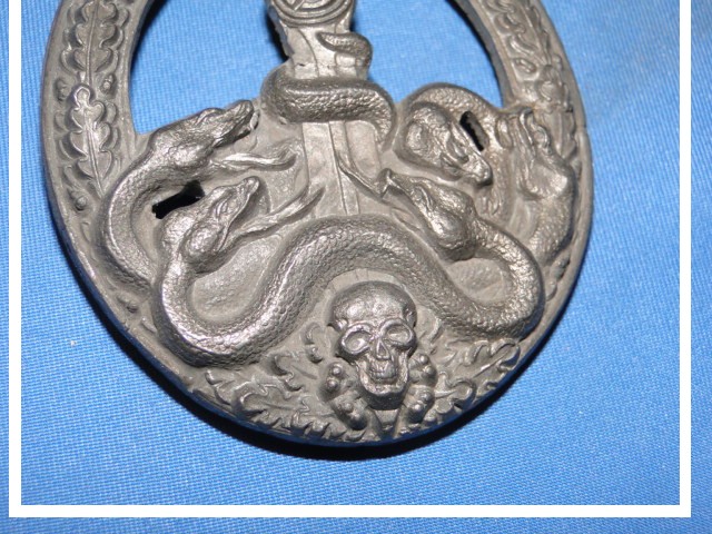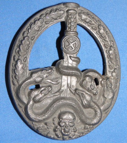 The design of the badge was fairly sinister. It consisted of an oval shape wreath with a sword
