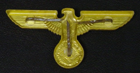 The item featured in this section is a WWII German Army eagle. As employed in military hats. Three metal prongs were bent into place to secure the piece to the headgear. Each branch of the service;