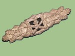 The shape of the badge is long and thin. The center is a square that has a single, long laurel leaves shooting out to
