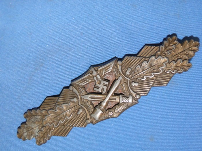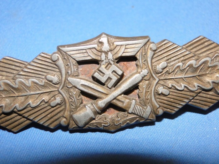 This is a German WWII Close Combat clasp. This award was instituted on November 25th, 1942. There were three grades issued; Bronze, Silver and Gold. The physical appearance of the the badges was identical from class to class. The only difference was the color. Requirements for receiving the award of the Close Combat badge are listed below.
