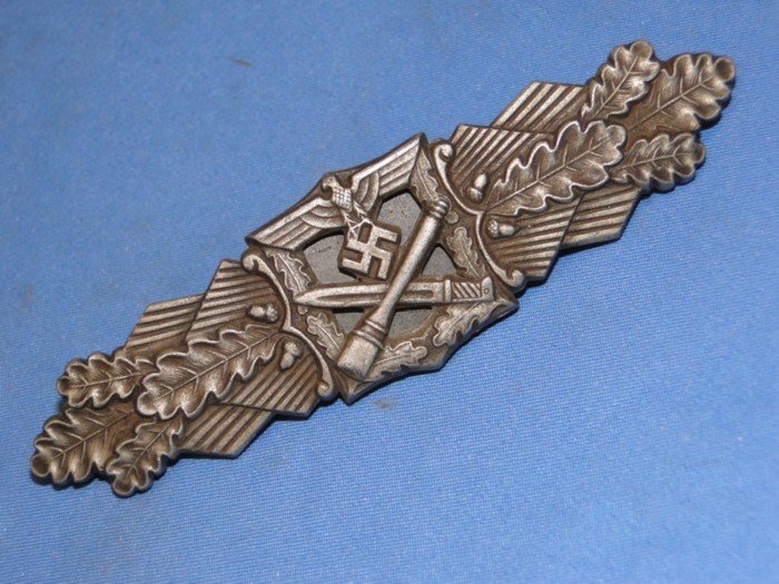 This is a German WWII Close Combat clasp. This award was instituted on November 25th, 1942. There were three grades issued; Bronze, Silver and Gold. The physical appearance of the the badges was identical from class to class. The only difference was the color. Requirements for receiving the award of the Close Combat badge are listed below.