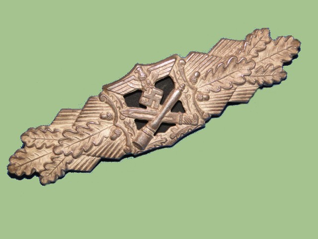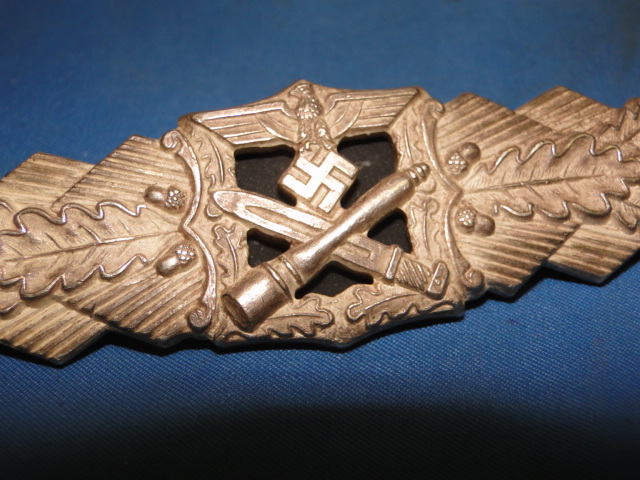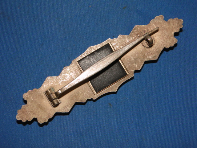 This is a German WWII Close Combat clasp. This award was instituted on November 25th, 1942. There were three grades issued; Bronze, Silver and Gold. The physical appearance of the the badges was identical from class to class. The only difference was the color. Requirements for receiving the award of the Close Combat badge are listed below.
