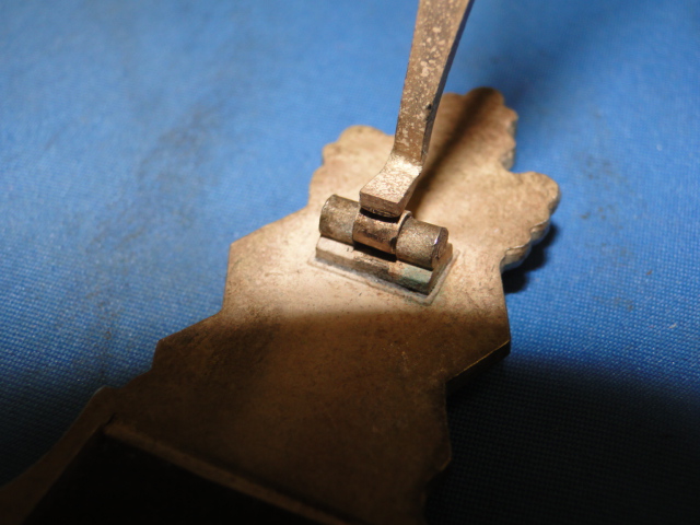 A vertical pin is hinged at the top of the badge. A catch is attached to the bottom portion, securing the pin shut. The award was worn on the tunic by passing the pin through loops sewn onto the jacket of the recipient.