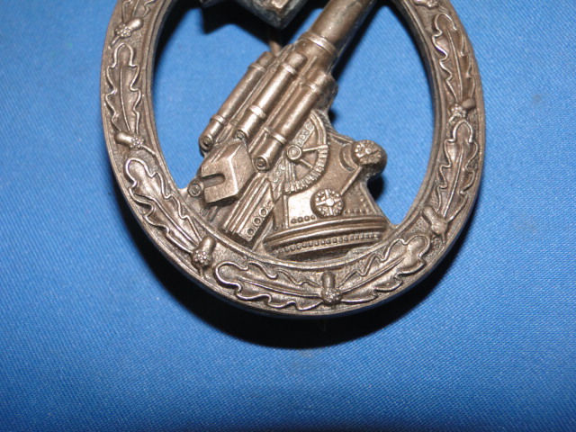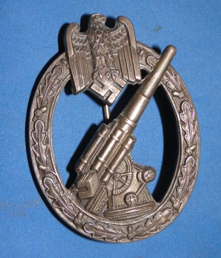 This WWII German Army Flak Badge may be currently reproduced. It is becoming more difficult to be able to tell the fake ones from the real ones because the quality of the reproductions is improving. The collector must become familiarized with the construction style and materials employed in the manufacturing of this item. Attention to the details is critical in order to be able to determine the authenticity of the collectible.