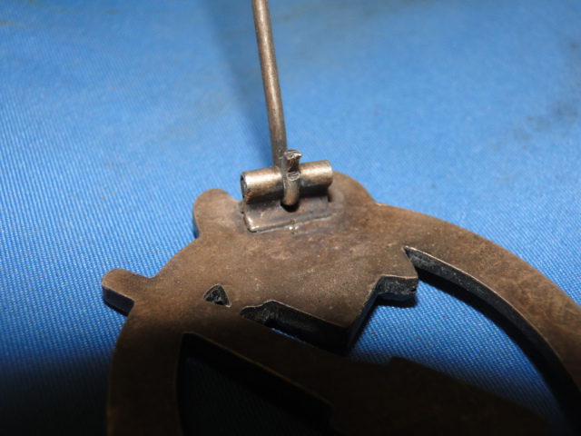 The soldier wore the badge on the uniform tunic. It was secured in place by passing the badge's pin through a series of loops, two or more, that were sewn in the jacket.