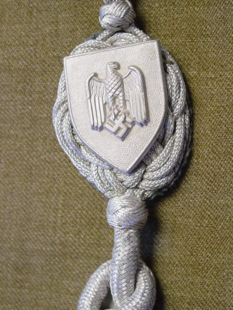 This is a WWII Army Markman's award lanyard. Bullion construction with a felt backing. Very high quality production item. This award was given in 12 different grades, which would be recognized by the addition of swords to the shield, changes in color, addition of acorns to the end of the lanyard and other variations.