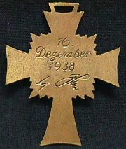 The back of the cross has a Flat and plain design. The date of "December 16, 1938" is engraved alomg with Hitler's