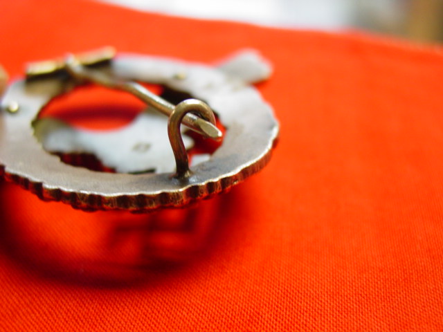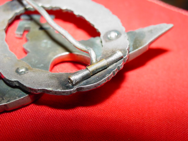 This picture shows a close up look at the German WWII Pilot badge pin catch. This is how the pin was secured shut.