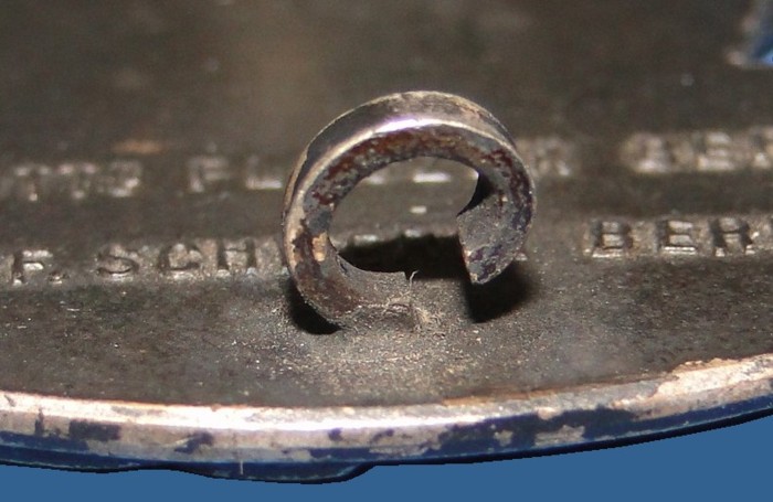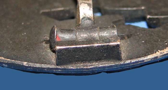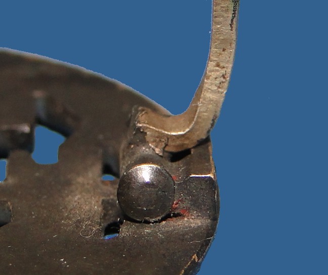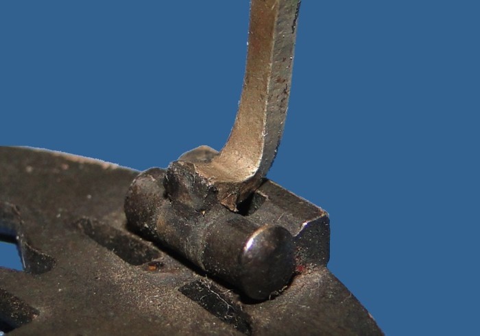 The back has a single thick pin. Coke bottle shape. A heavy duty block hinge is soldered at one end. A thick catch is found
