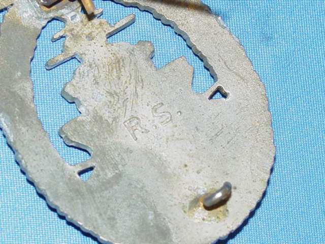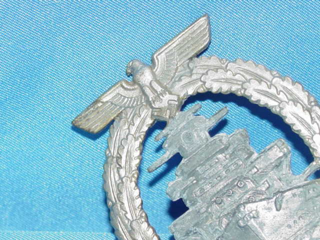The shape of the badge is that of an oval wreath. An eagle has been placed in the upper portion of the oval. It has the wings spread out and the head faces left. As with most badges, the eagle is clutching a swastika. Right below that is the frontal view of a destroyer. The waves at the bow are parting as to indicate motion. The main guns are facing forward. Nice detailing to windows. Very sharp and square. Other components of the ship have similar definition. Normally the wreath would be guilded, however, it is common for the color to wear out through normal use and time. The color turns into a shade of silver/gray.