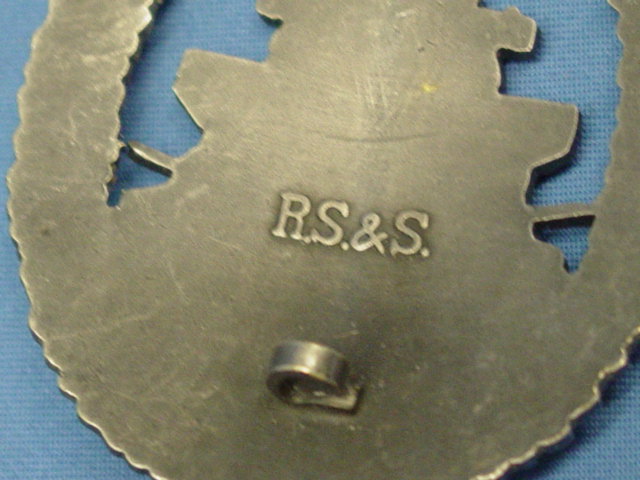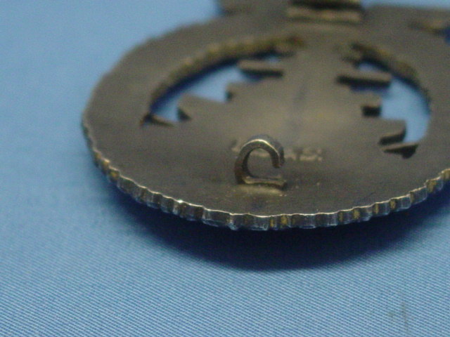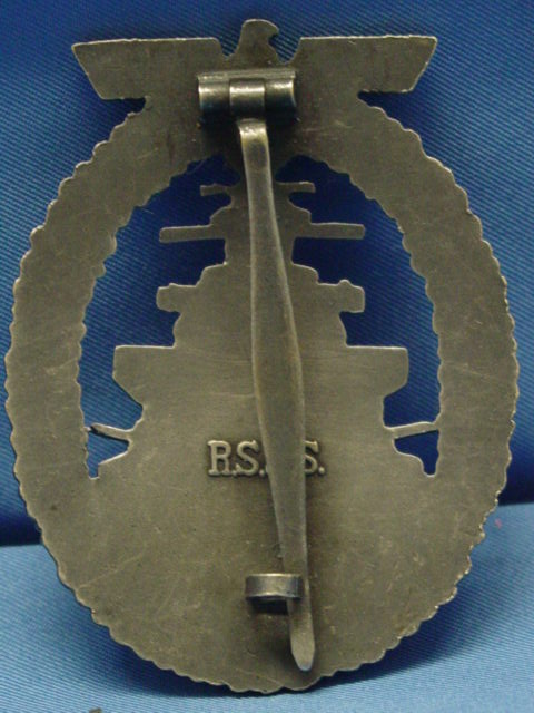 The shape of the badge is that of an oval wreath. An eagle has been placed in the upper portion of the oval. It has the wings spread out and the head faces left. As with most badges, the eagle is clutching a swastika. Right below that is the frontal view of a destroyer. The waves at the bow are parting as to indicate motion. The main guns are facing forward. Nice detailing to windows. Very sharp and square. Other components of the ship have similar definition. Normally the wreath would be guilded, however, it is common for the color to wear out through normal use and time. The color turns into a shade of silver/gray.
