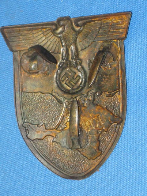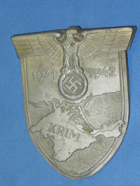 This WWII German Krim shield may be currently reproduced. It is becoming more difficult to be able to tell the fake ones from the real ones because the quality of the reproductions is improving. The collector must become familiarized with the construction style and materials employed in the manufacturing of this item. Attention to the details is critical in order to be able to determine the authenticity of the collectible.