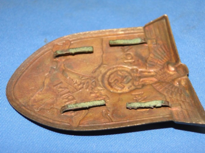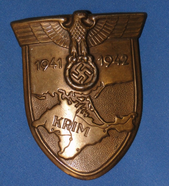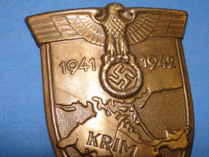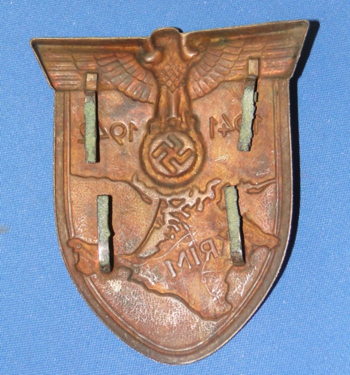 This WWII German Krim shield may be currently reproduced. It is becoming more difficult to be able to tell the fake ones from the real ones because the quality of the reproductions is improving. The collector must become familiarized with the construction style and materials employed in the manufacturing of this item. Attention to the details is critical in order to be able to determine the authenticity of the collectible.
