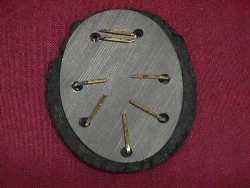 The design consists of a metal oval backing plate. The front is covered with black wool