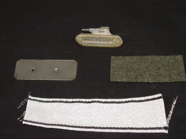 The tank destroyer award consisted of three separate pieces. A rectangular piece of gold cloth with Two black solid lines run the length of the strip. one placed in the upper side the other in the lower side. A