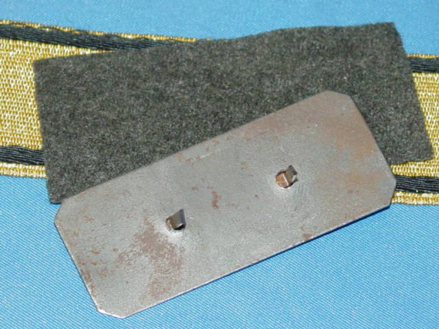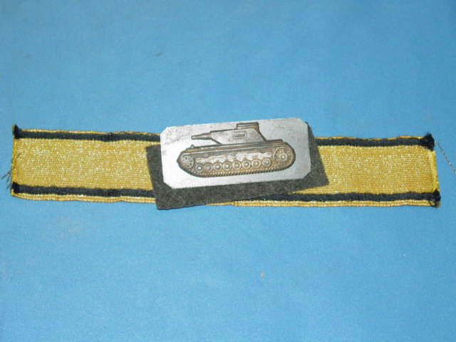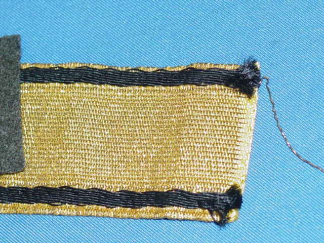 The tank destroyer award consisted of three separate pieces. A rectangular piece of gold cloth with Two black solid lines run the length of the strip. one placed in the upper side the other in the lower side. A