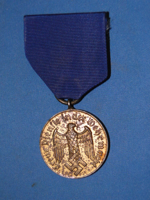 The medal displays a Wehrmarcht eagle in the front. The phrase "Treue Dienste in der Wehrmacht". The reverse