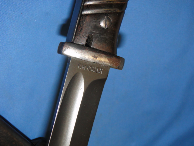 The base of the blade has two sets of markings. One side reads F.W. Holler. The other side has the serial number