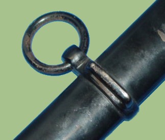 The throat has a ring on each side. The sword hanger attaches to the rings. It consists of a semi-circular section of blue leather. The top part has two aluminum, rectangular shaped structures, one mounted on top of the other. A belt goes through the rectangular pieces in order to attach the sword to the uniform.