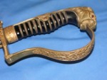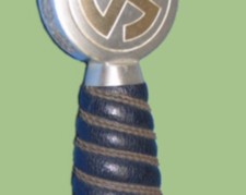 The design of the sword consists of a round pommel with a swirled swastika in gold. Displayed on both sides. Dark corynthian leather handle. Silver wire wrapped. The handguard consists of dounward pointing curved sections.