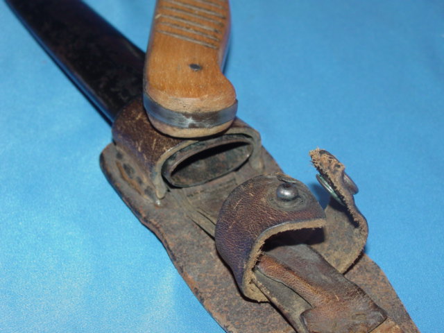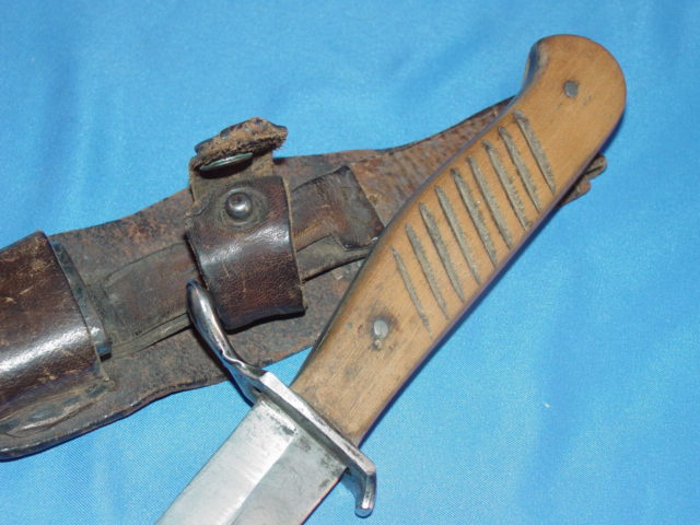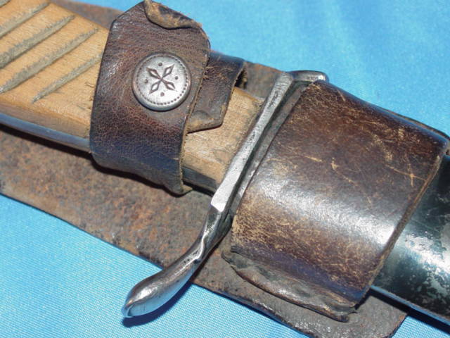 The crossguard was very thin. It had one side that protruded out while the other ended at the edge of the handle and pointed downward very sharply. The scabbard was amde of metal and was painted black. Some of them had a built-in hook that was used to secure the knife to the boot or a belt. This particular example has a leather frog.