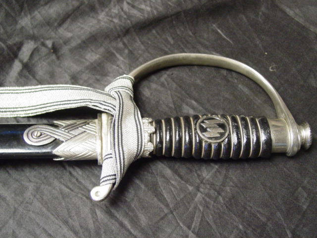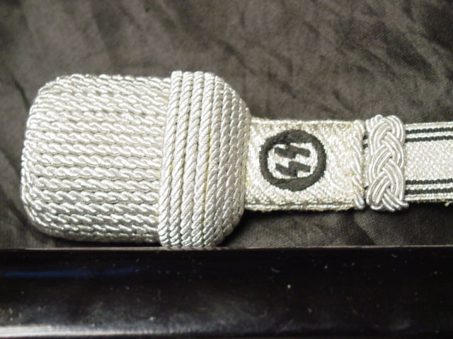 A silver thread portapee is provided with the sword. The SS runnes are embroidered to one end. The