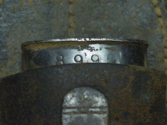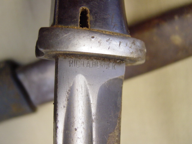 The base of the blade is marked with the manufacturer's logo which reads "Rich A Herder". The other side of the base is marked with the production number and a maker marking. The number in the scabbard and the base of the blade originally had matching numbers. This example does not match.