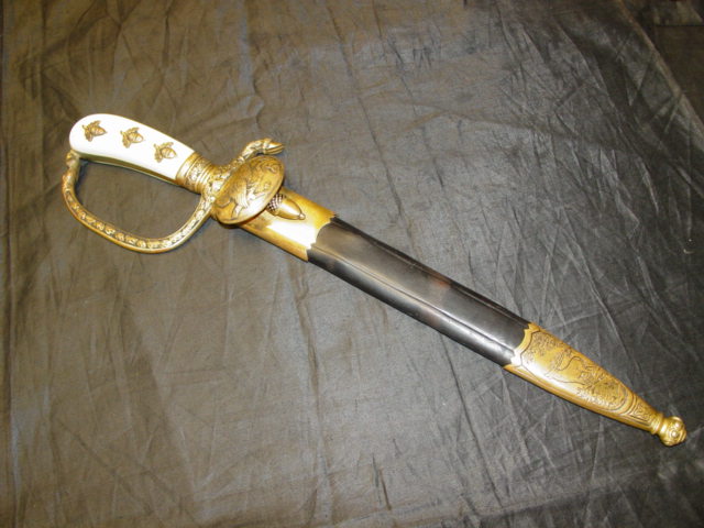 which is covered with foliage design. One side of the crossguard converts into a "D" handle